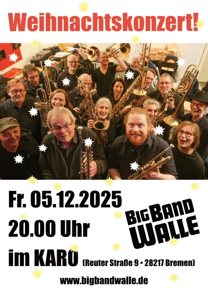 es wieder soweit, am 05.12 spielt die Big Band Walle ihr alljährliches Weihnachtskonzert im Karo. Wir freuen uns auf ein weiteres großartiges Konzert mit Diethra Bishop als Sängerin, ein paar Weihnachtsliedern und einer Menge Swing- und Funk-Arrangements im Gepäck. Mit