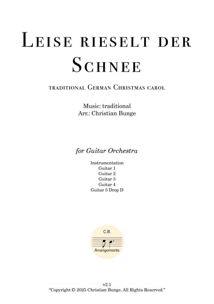 Leise rieselt der Schnee ist für fünf Gitarren eingerichtet. Das thematische Material wird zwischen den Stimmen weitergereicht und durch kontrapunktische Elemente ergänzt. Die Satzstruktur fördert das Zusammenspiel und das bewusste Hören innerhalb des Ensembles.